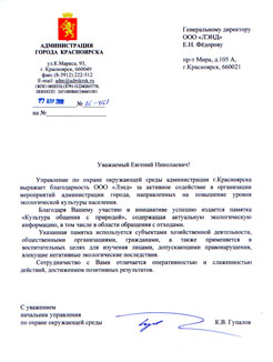 Благодарственное письмо Красноярской